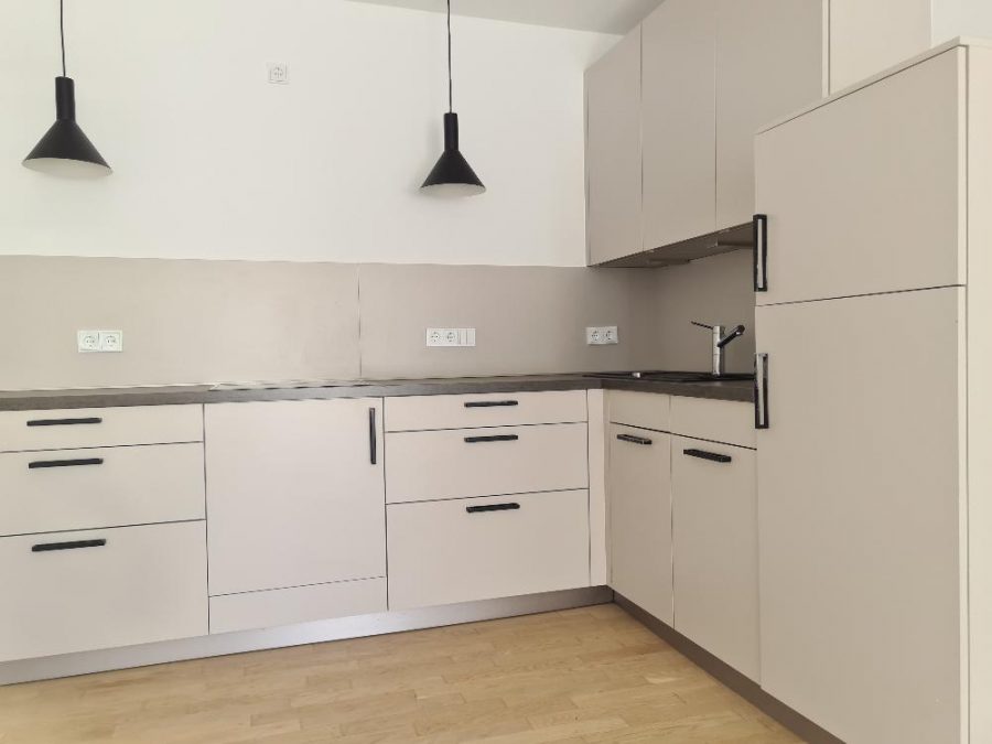 schickes Bad mit großer Dusche, bodentiefer Einstieg, eleganter Waschtisch mit Unterschrank, wandhängendes WC mit Unterputzspülkasten, zusätzlicher Handtuchheizkörper; schicke Einbauküche